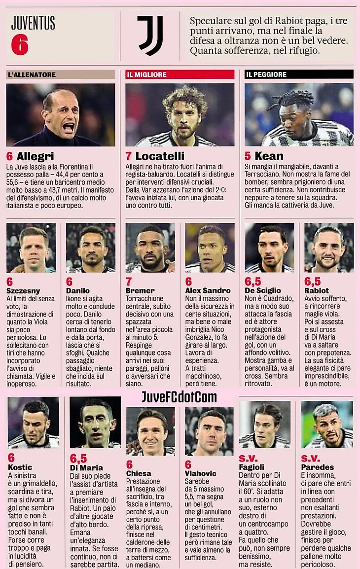 Несмотря на откровенно не самую высокую оценку, Мануэль Локателли был вновь отмечен болельщиками Ювентуса как наиболее вовлеченную фигуру на протяжении всего времени на поле и отдали именно ему звание лучшего футболиста по итогам большинства голосований. Той же позиции отметились и итальянские журналисты, признав Локателли лучшим по итогу 90 минут.
