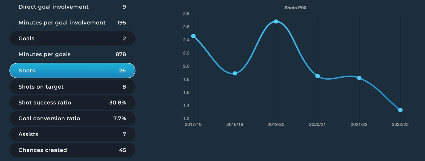 В сравнении с сезонами в Гамбурге и Айнтрахте, Костич стал гораздо меньше бить по воротам, потерял в точности ударов и в итоговой результативности.