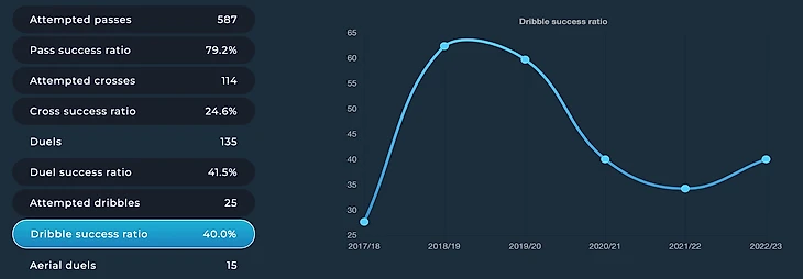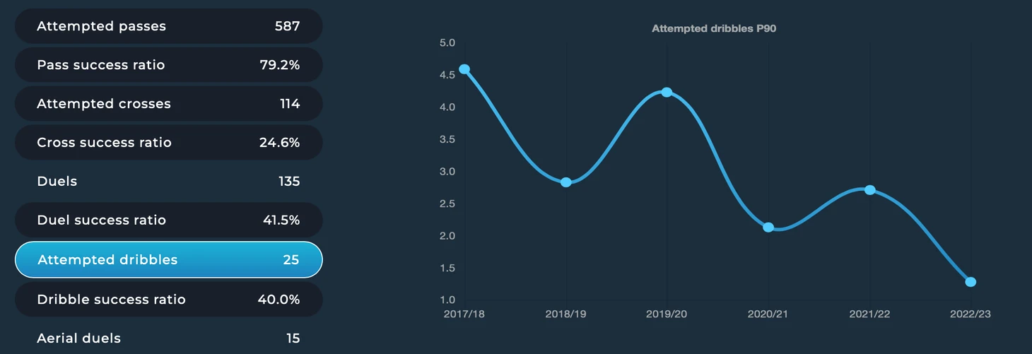 Костич реже использует дрибблинг и старается обходить соперника в спринте. Его данные почти соответствуют в этом качестве предыдущему сезону, который стал лучшим в карьере Филипа.