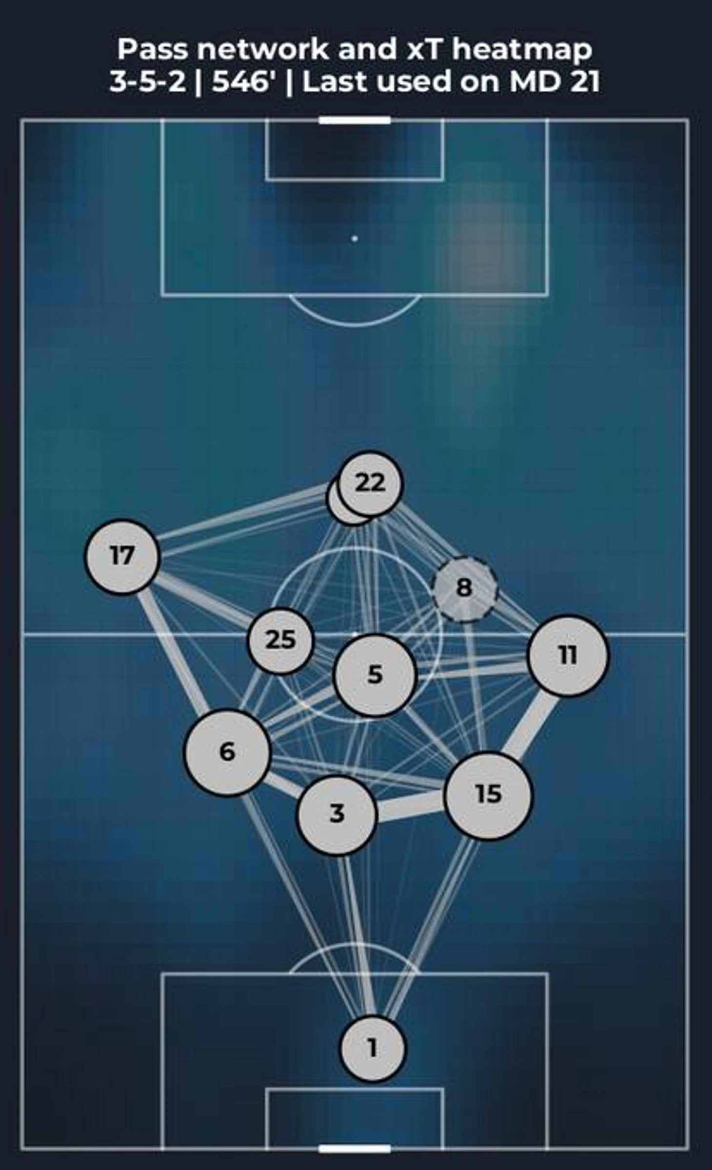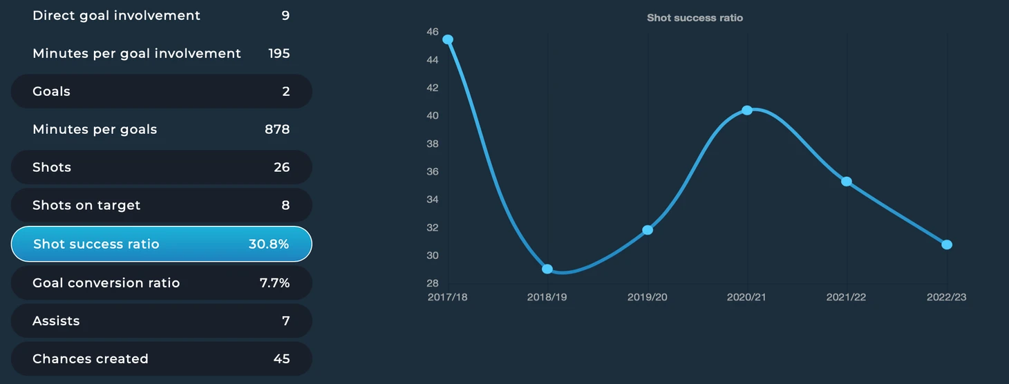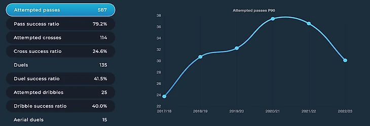 Он куда реже выступает участником комбинационного футбола в угоду навесам и дальним передачам. При этом его точность несоразмерно выросла именно при использовании дальних передач, что искренне поражает.