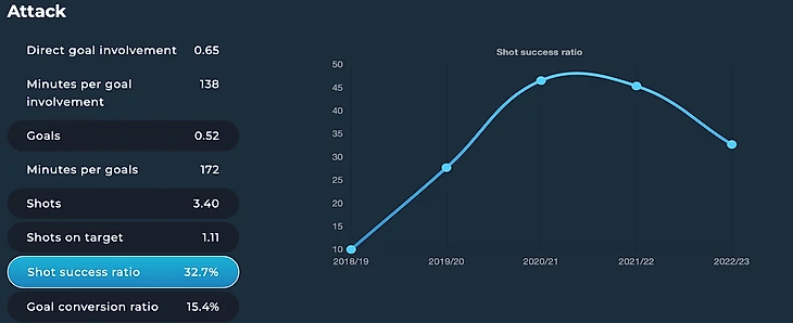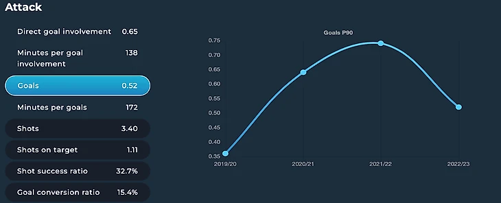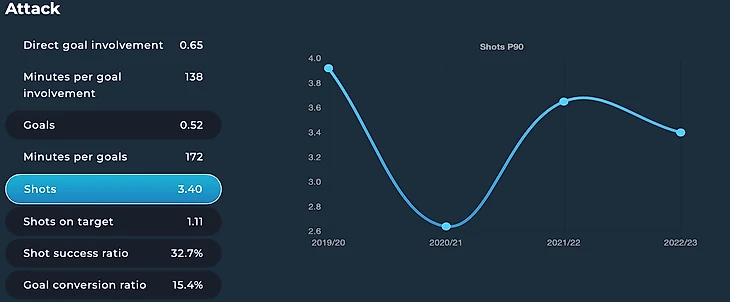 В плане результативности, Влахович идет в соответствии с поставленным ранее потолком в Ювентусе - гол каждую вторую игру. Это сильно проседает на фоне его игры в Фиорентине в последние два сезона. Сегодня Влахович забивает раз в 172 минуты при 3,4 ударах за матч - в створ попадает лишь 32,7%, а в голы конвертируется и вовсе 15,4% ударов.