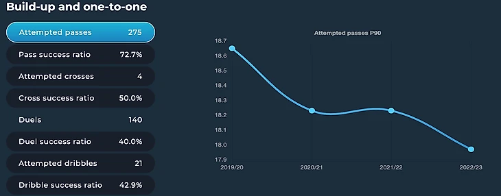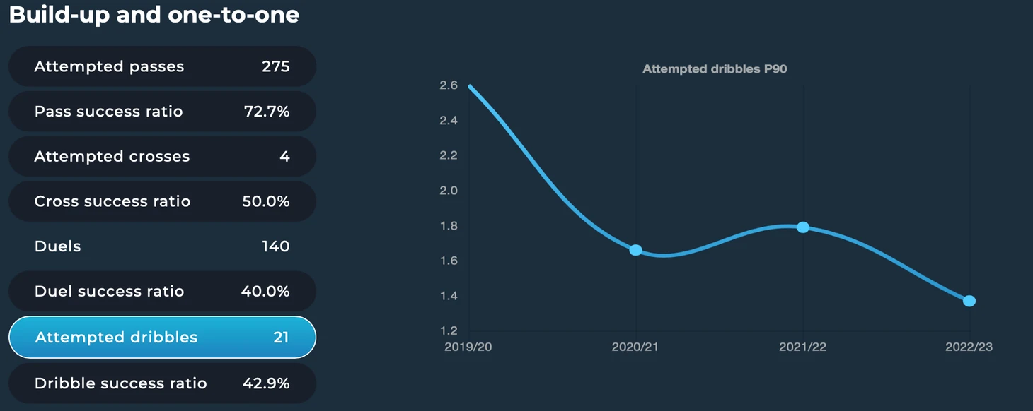 Отметим и снижение в процентном соотношении попытки отрабатывать с защитниками один в один - Душан почти перестал пускаться в дриблинг, а если и пробует - повезет лишь в половине случаев, даже меньше.