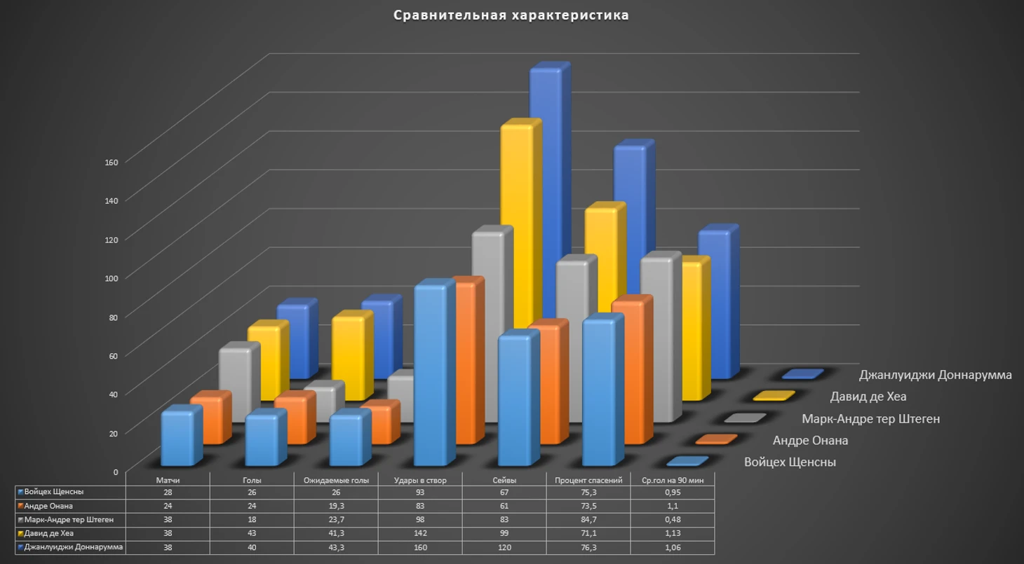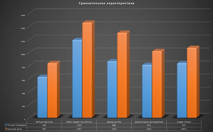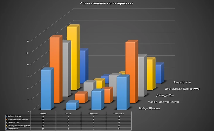 И, как в любой постановке вопроса относительно качества, нам потребуется сравнительный образец. В данном конкретном случае возьмем сразу четырех киперов, играющих в разных чемпионатах и разных системах, но коих объединяет определенное отличительное свойство - контракт с топовым клубом и весомое вовлечение в итоговые результаты. Нашими демонстрационными кандидатами для сравнения качественных и количественных характеристик навыков Войцеха станут Андре Онана, Марк-Андре тер Штеген, Давид де Хеа и Джанлуиджи Доннарумма. Последние трое не раз становились лучшими голкиперами чемпионатов, в которых принимали участие, поэтому их вклад в успехи своих команд вряд ли будет оспорим.