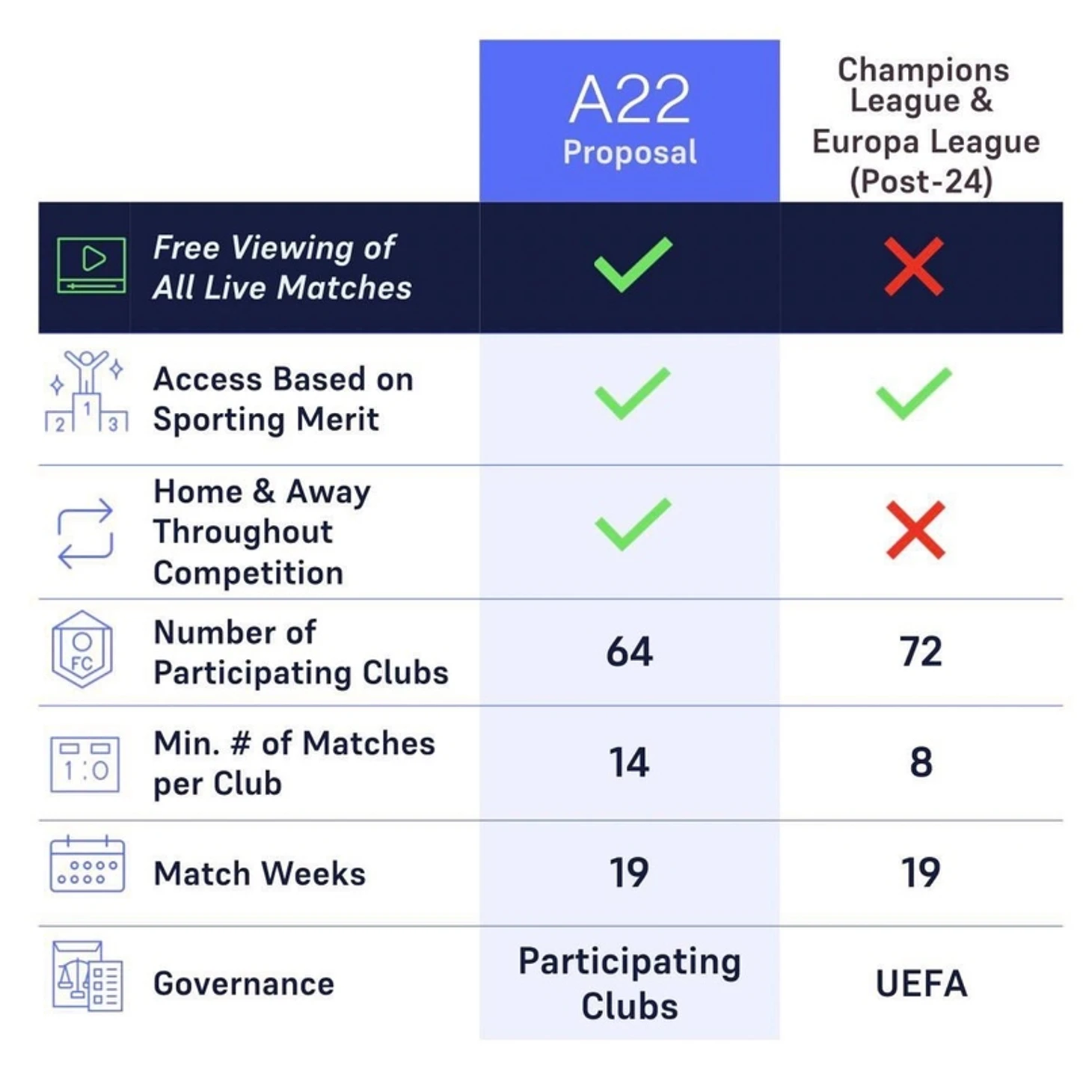 «Мы юридически получили право конкурировать. Европейский клубный футбол отныне бесплатный. Монополия УЕФА, которая длилась почти 70 лет, наконец-то закончилась, и решение Суда имеет положительные и далеко идущие последствия для футбола. Мы продолжим работать с клубами, лигами и другими заинтересованными сторонами, не опасаясь штрафов, чтобы создать лучшие и наиболее ориентированные на болельщиков футбольные соревнования в Европе. В частности, мы сохраним нашу приверженность национальным лигам и футбольной пирамиде, и впервые с 1955 года общеевропейские соревнования смогут управляться одними и теми же участвующими клубами, как это бывает практически во всех европейских национальных лигах».