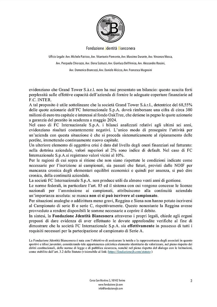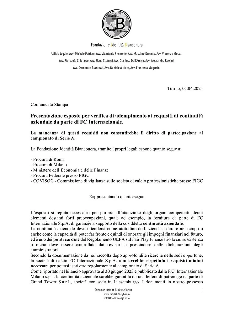 В своем заявлении фонд Jdentita Bianconera поставил под сомнение соблюдение принципа «непрерывности ведения бизнеса» компанией, известной под спортивным брендом Football Club Internazionale Milano, или просто «Интер». Статья 85 спортивного кодекса FIGC указывает данный критерий в перечне обязательных признаков соответствия перед получением лицензии для участия в следующем сезоне под эгидой УЕФА и FIGC. Посему нарушение влечет за собой отказ в предоставлении регистрации на сезон и отстранение футбольной команды с переводом в низшую лигу, вплоть до любительских дивизионов.
