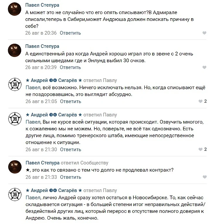 Дальнейшие комментарии в группе хоккеиста также не выглядят хоть сколько убедительными.