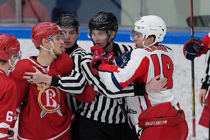 Второй период вообще состоял сплошь из остановок игры, связанных с удалениями игроков обеих команд. Соперники набрали 75 минут штрафа за период. В принципе, это не редкость в матчах с участием «Русских Витязей». Только вот гости отбывали наказание чаще, а по шайбам в большинстве счет был 1:1. В середине матча «Витязи» 12 секунд оборонялись втроем, но, как только вышел четвертый, Егор Корбит с помощью рикошета пробил Чечелева, 1:2.