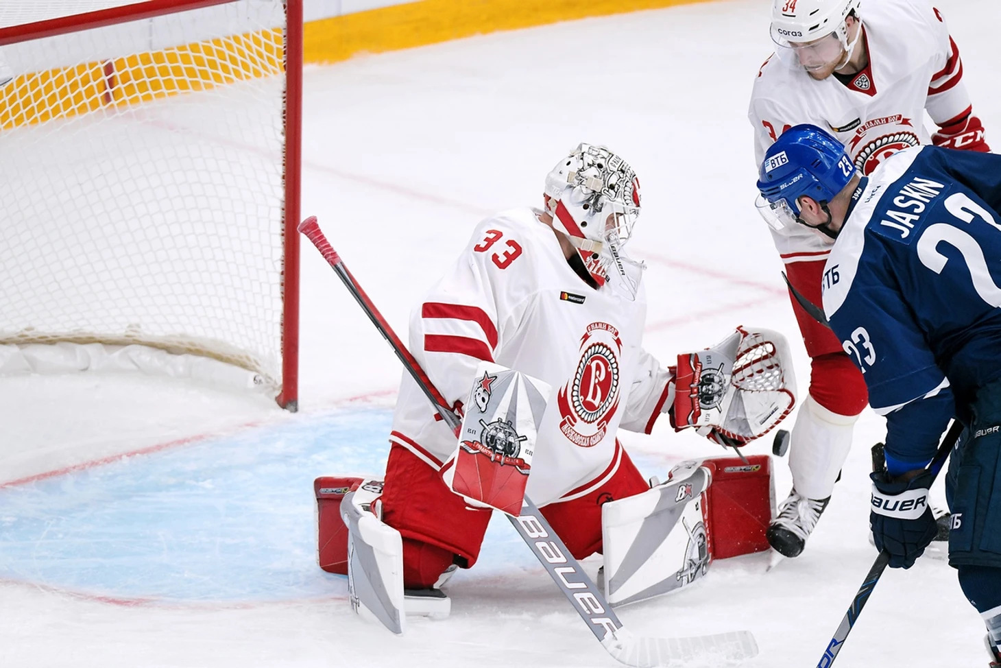 У «Динамо» был свой стимул, команда явно не хотела заканчивать турнир с тремя поражениями. И в дебюте третьего периода Ежову пришлось попотеть. Он спас команду в первой же смене, затем была атака «бело-голубых» во время которой ему пришлось отражать три броска подряд.