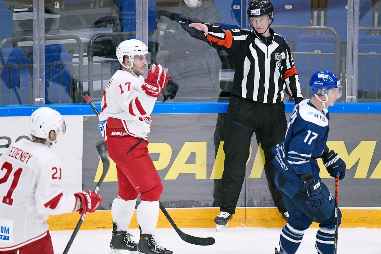 Поэтому нет ничего удивительного в том, что в первых двух периодах зрители голов так и не увидели. «Динамо» больше времени проводило в зоне атаки, но извлечь пользу из этого не могло. Действовало слишком просто, поднимая шайбу наверх и бросая от синей линии в надежде на рикошет и активную борьбу на пятаке. Показательный момент был во втором периоде. «Дальние лавки» были выгодней «Динамо». Они этим пользовались, и в одной из позиционных атак три минуты не выпускали «Витязь» из его зоны. Но моментов за это время так и не создали.