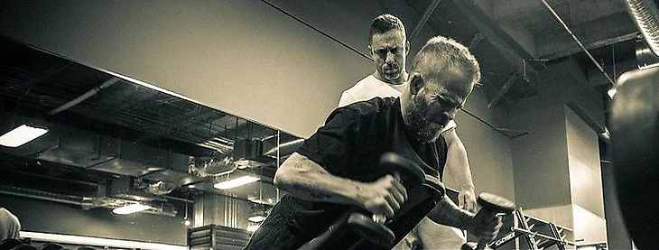 Заканчивается тренировка на велотренажере Assault Bike (специальный тренажер, в котором установлен вентиляторный маховик; он создает дополнительное сопротивление воздуха, и чем быстрее вы крутите педали, тем тяжелее вам становится). На велотренажере выполняется 15 повторений по 15 секунд с максимальным усилием через 45 секунд медленного восстановления.