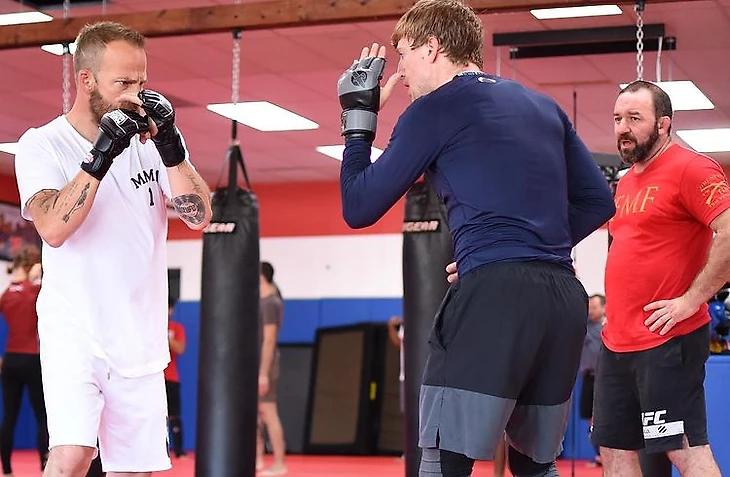 «Я фанатею от этого спорта уже давно. Ранее я снимался в тюремной драме «Преступник» вместе с Вэлом Килмером. На съемках я познакомился с тренером Грегом Джексоном, а также бойцами Дональдом Серроне (бывший претендент на звание чемпиона в легком весе UFC – прим. Sports.ru) и Рашадом Эвансом (чемпион UFC в полутяжелой весовой категории – прим. Sports.ru). В сценах боев на заднем дворе тюрьмы мы использовали некоторые движения и приемы из ММА».