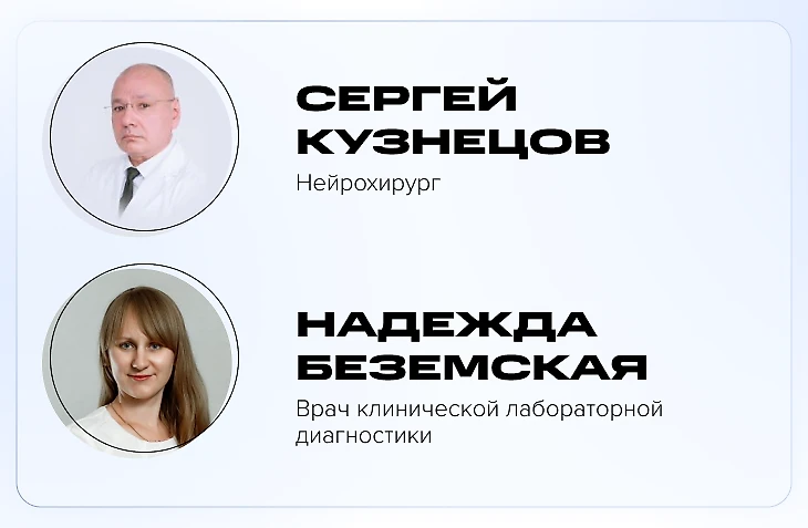 Приглашенные эксперты: Сергей Кузнецов (нейрохирург, медицинский центр «СМ-Клиника», окончил Астраханский государственный медицинский институт), Надежда Беземская (врач клинической лабораторной диагностики, биохимик, эксперт лаборатории СИТИЛАБ)
