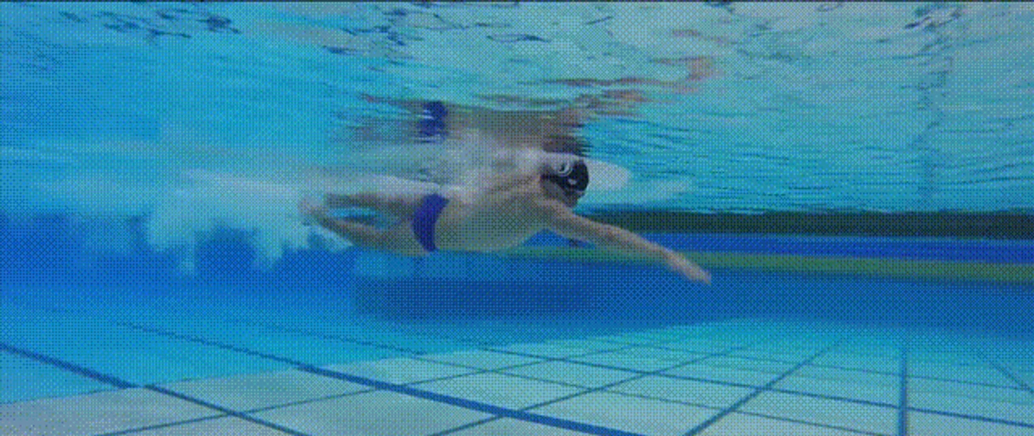 Подтягивание. Рука продолжает сгибаться в локтевом суставе (до 90°), кисть уходит под грудь, живот и вниз ближе к тазу. Здесь подключается широчайшая мышца спины. В подводной фазе ладонь немного ломается относительно предплечья, образуется угол. Ладонь должна смотреть назад и направлять воду вдоль себя.