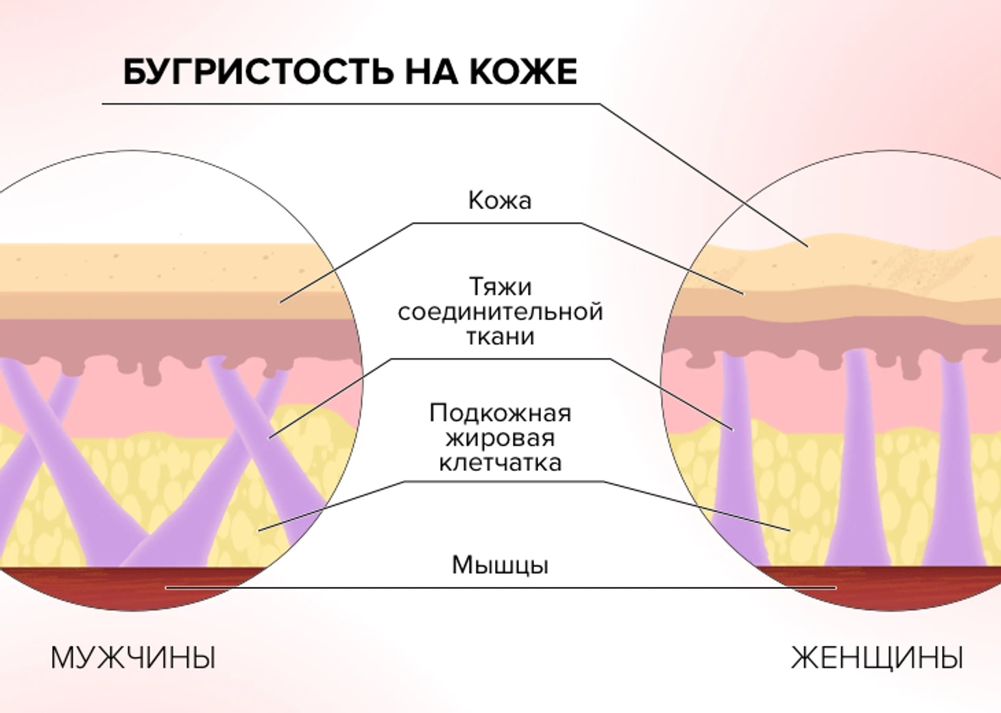 Считается, что мужчины менее склонны к целлюлиту из-за отличающегося строения подкожной жировой клетчатки – соединительнотканные тяжи образуются крест-накрест и под меньшим углом, из-за чего даже при накоплении жира натяжение распределяется более равномерно, бугристость не так заметна.