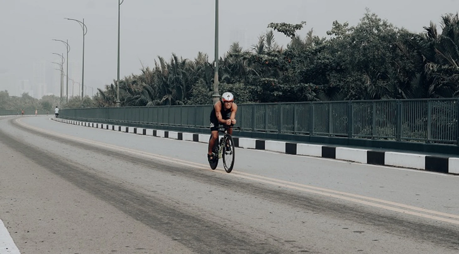 Она включает плавание на 1,5 км, езду на велосипеде на 40 км и бег на 10 км.