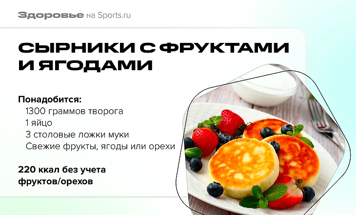 Ингредиенты. 300 граммов нежирного творога, 1 яйцо, 3 столовые ложки муки, свежие фрукты, ягоды или орехи.