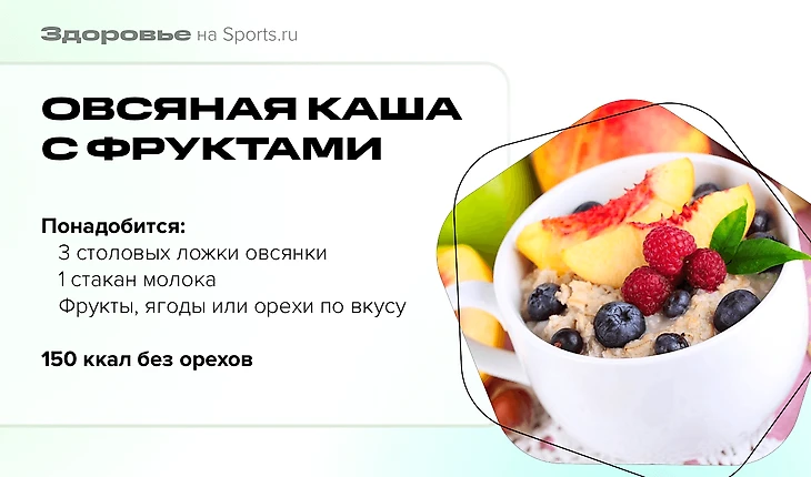Ингредиенты. 3 столовых ложки овсянки долгой варки, 1 стакан молока/воды, свежие фрукты, ягоды или орехи.