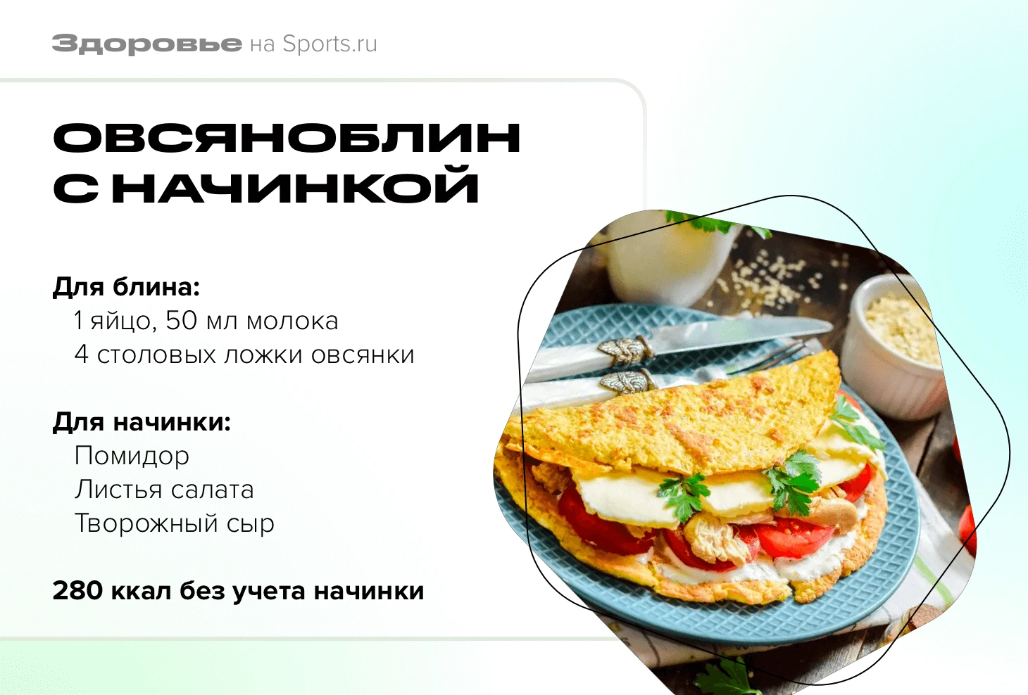 Ингредиенты. Для блина: 1 яйцо, 50 мл молока или нежирного кефира (можно заменить водой), 4 столовых ложки овсянки (лучше брать хлопья долгой варки). Для начинки на выбор: помидор, листья салата, творожный сыр/вареная курица, сыр, помидор, зелень/банан и арахисовая паста без сахара.