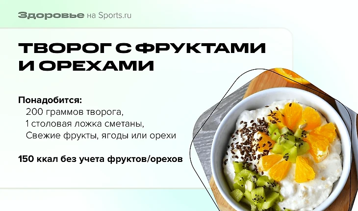 Ингредиенты. 200 граммов творога невысокой жирности, 1 столовая ложка сметаны, свежие фрукты, ягоды или орехи.