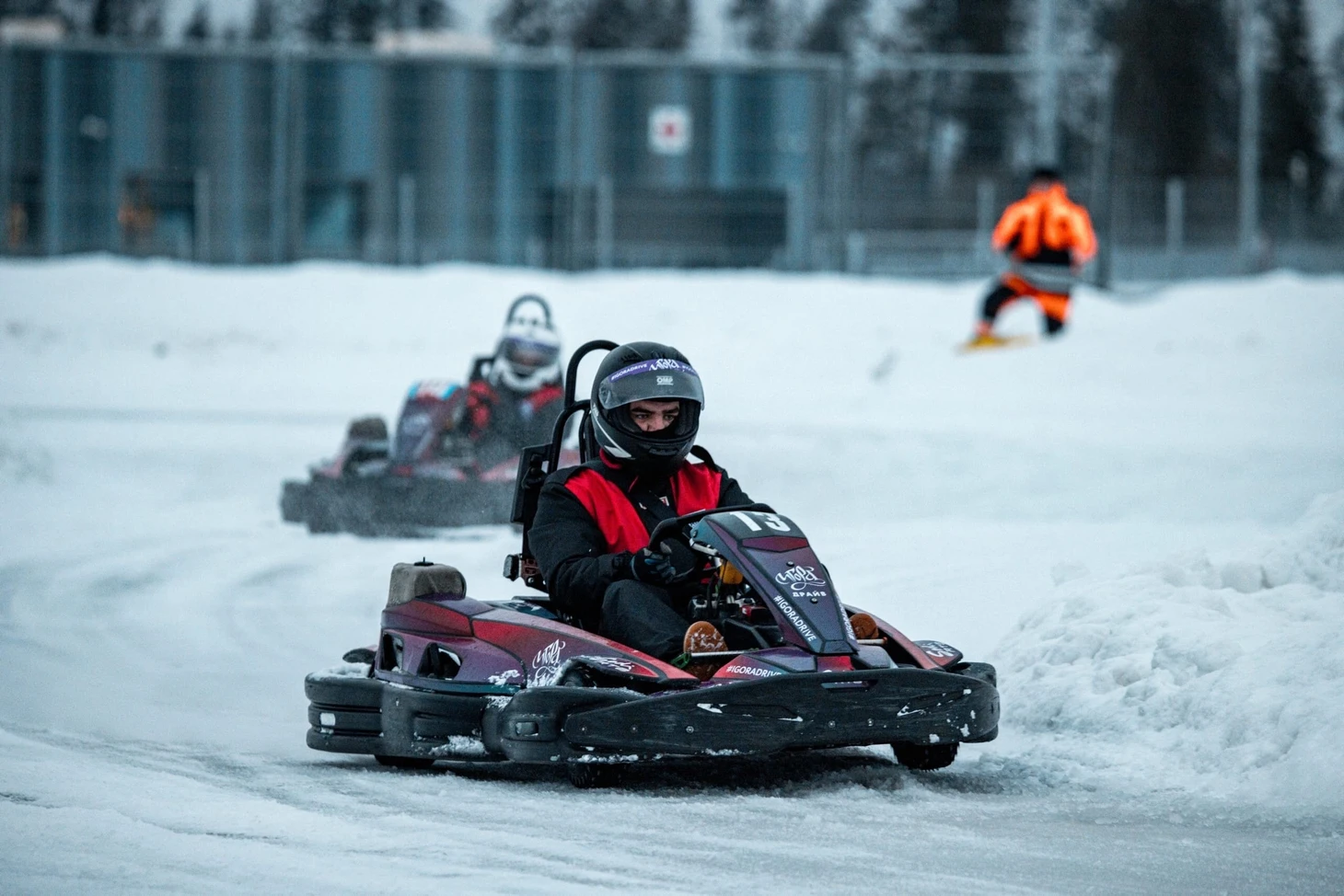 Если же своего автомобиля нет или вы пока не уверены в навыках, там же можно попробовать зимний картинг на специальной ледовой трассе длиной 450 метров. Трасса расположена под открытым небом, на картах стоит шипованная резина, а гонщики могут взять в аренду утепленный комбинезон.
