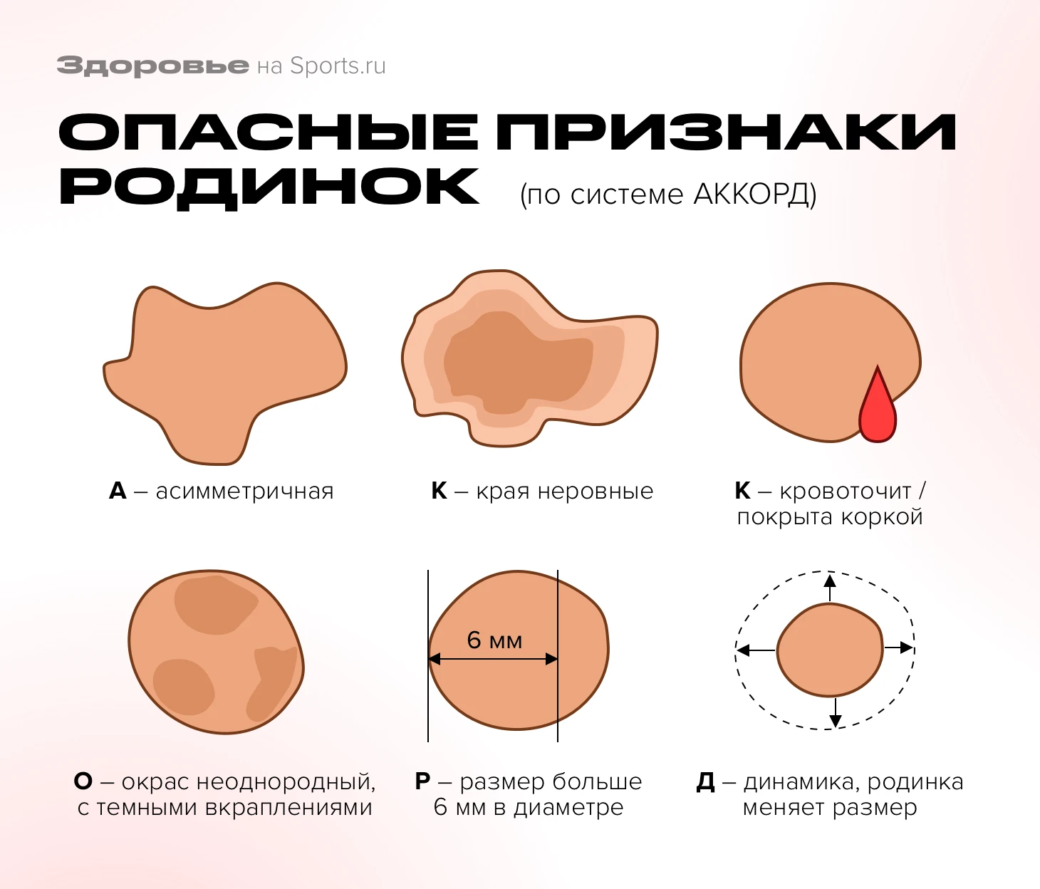 Чтобы вовремя распознать опасную родинку, нужно проводить самостоятельную первичную диагностику до 10 раз в год. В этом поможет алгоритм, который называется АККОРД. Это система наблюдения, которая оценивает родинки по шести характеристикам: асимметрия, край, кровоточивость, окрас, размер, динамика. Если хотя бы по одному из этих параметров родинка изменилась, нужно незамедлительно обратиться к врачу.