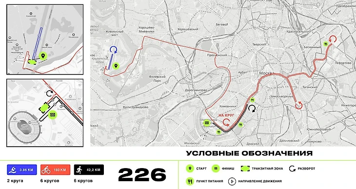 113 км («половинка», полужелезная, средняя дистанция) – 1,9 км плавания в Гребном канале, 90 км велогонки от Крылатского до Лефортово, забег 21 км по набережным Москвы-реки.