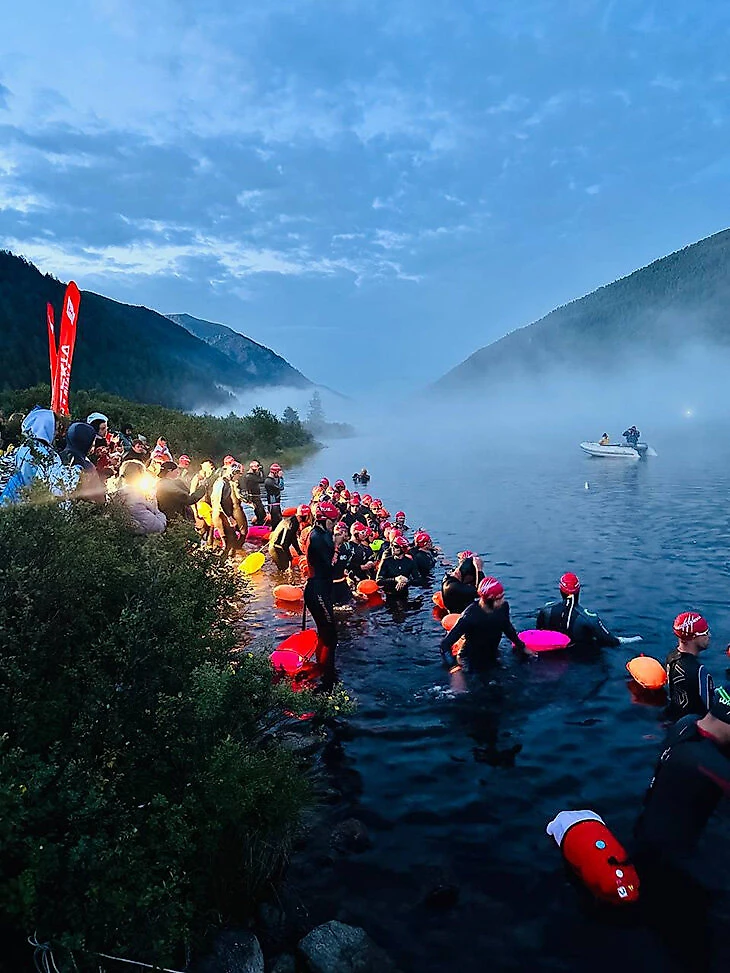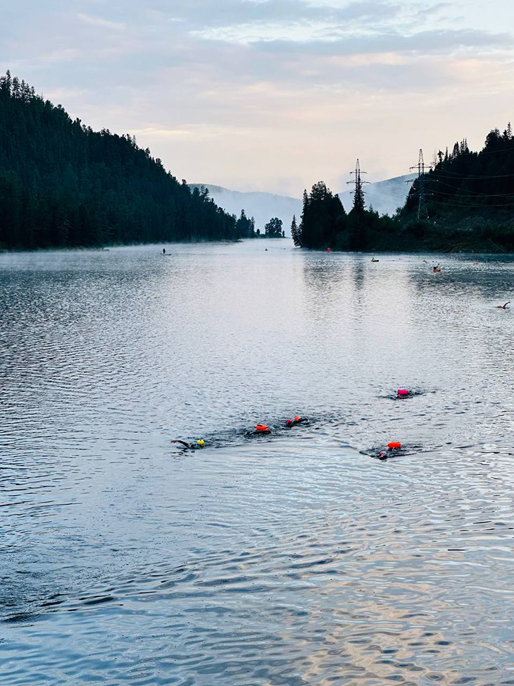 Стартовали в 5 утра. Темно, воздух +5 °C. Вода ледяная – хотя для горного озера это вполне нормальная температура, +13-14 °C. Я очень сильно замерзла, и, если честно, ждала, когда этап закончится. Плавание длится 30-40 минут на короткой дистанции (113 км), и час-полтора на длинной (226 км).
