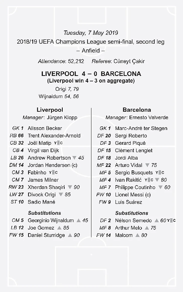 Несмотря на все это, стоит напомнить себе об удивительных сведениях о квалификации «Барсы» по прибытии в Мерсисайд. Помимо того, что они были чемпионами Ла Лиги, они не были побеждены в своих предыдущих одиннадцати матчах Лиги чемпионов, в процессе выиграв восемь из них и сохранив шесть раз свои ворота в неприкосновенности. Они не смогли забить лишь пять раз в своих предыдущих пятидесяти шести играх. Единственное поражение в их предыдущих двадцати двух европейских играх было нанесено «Ромой» в четвертьфинале 2017/18, хотя поражение со счетом 3:0 во втором матче стало источником вдохновения для «Ливерпуля», который добивался аналогичного результата, тем более что в тот вечер вратарем «Ромы» был Алиссон.