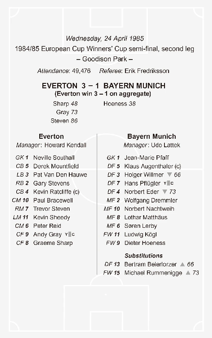 То была эпоха Невилла Саутхолла, Питера Рида, Кевина Рэтклиффа, Энди Грэя и Пэта Ван Ден Хауве гарантировавших, что если кто-то хотел физической битвы с «Эвертоном», то они перед началом матча были все равно что побежденные. «Бавария» засвидетельствует это, хотя самый серьезный удар, который они получили на «Гудисоне», был нанесен их самолюбию.