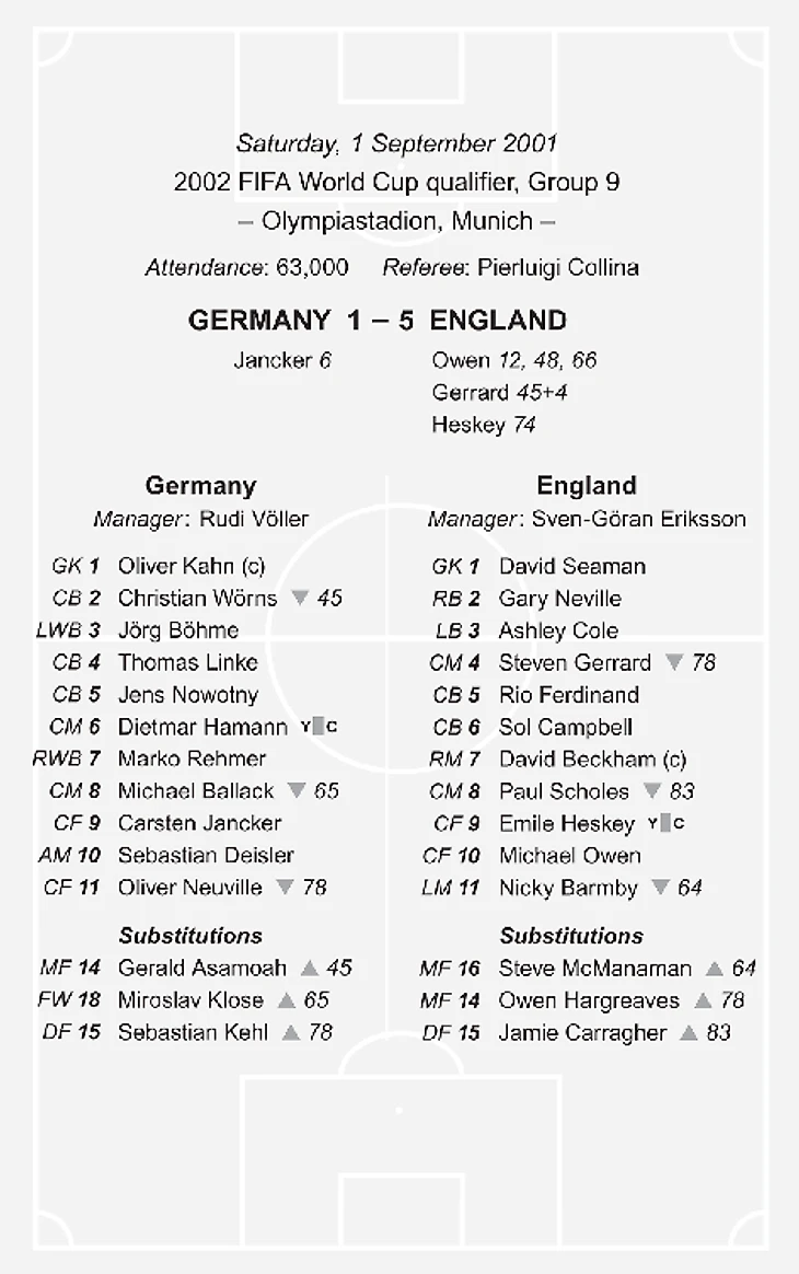 Манера и масштаб победы в сентябре 2001 года стоили больше, чем три очка в группе. До Мюнхена с финала 1966 года Англия не обыгрывала Германию в матче чемпионата мира. Германия не проиграла ни одного отборочного турнира чемпионата мира за свои предыдущие шестьдесят лет и не терпела поражений в Мюнхене в течение двадцати восьми лет. Унижение одной из сильнейших наций мира на их собственной земле было некоторым возмездием за душераздирающие поражения в серии пенальти в Италии 90 и на Евро 96.