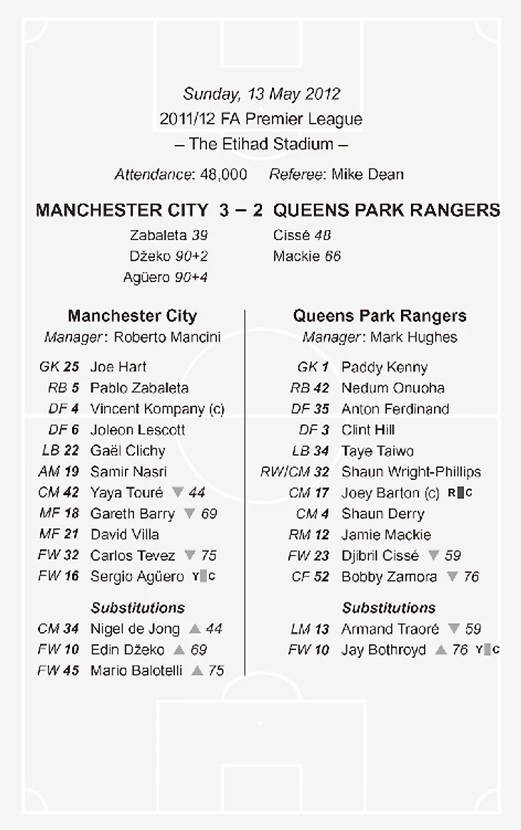 Агуэро завершил сорокачетырехлетнее ожидание титула с сорок четвертой попыткой забить гол. Это был не совсем последний удар в матче. Ботройд и Дерри возобновили игру, ударив в касание, и Клиши совершил вбрасывание из-за боковой на Харта, прежде чем судья Майк Дин завершил встречу, и глубокое разочарование быстро проехало 225 километров до «Стэдиум оф лайт», где игроки «Юнайтед», ходя туда-сюда впитали свое разочарование с лиц своих болельщиков, которые приехали на выезд.