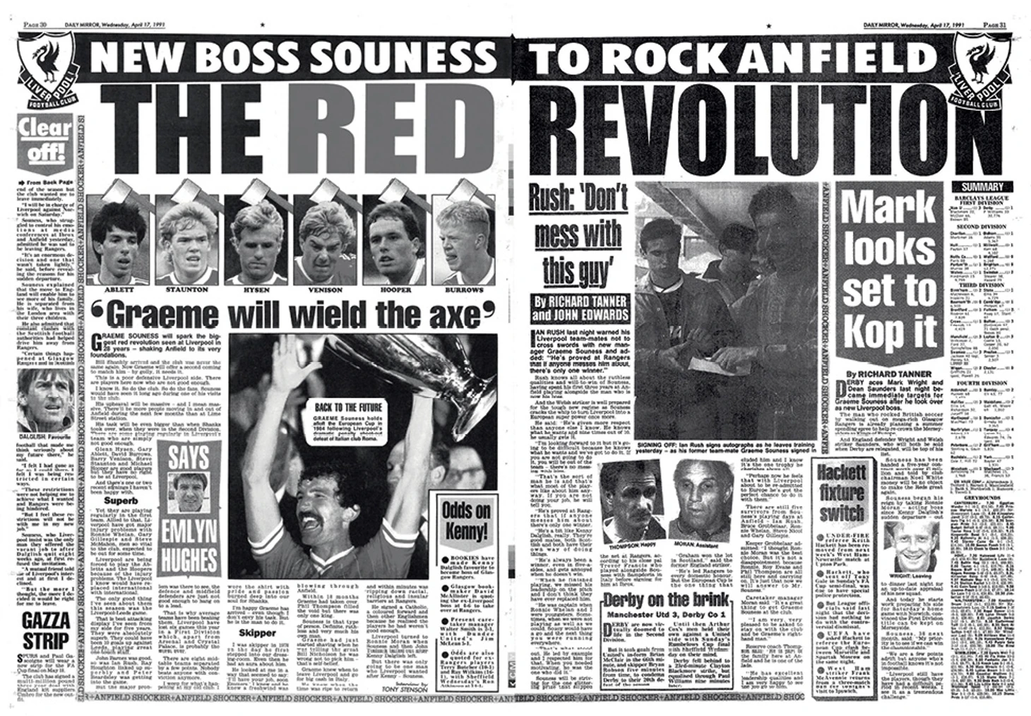 Сунесс утверждает, что ему потребовалось менее двух месяцев, чтобы понять: «"Ливерпуль" 1991 года был бледной тенью клуба, который я покинул в 1984 году». Он думал, что клуб потерял свой голод, и он унаследовал стареющую команду. Возможно, он был прав, так как на трибунах мы знали, что постоянный поток игроков из низших лиг, выявленный Джеффом Твентименом и его скаутской организацией, иссяк после ухода последнего в 1986 году. Сунесс понимал, что «Ливерпуль» был на вершине в течение десятилетий, потому что они всегда подписывали потенциальную замену для любого игрока первой команды, который проявлял признаки приближения к концу своей карьеры. Они покупали даже доминируя, чтобы обеспечить продолжение династии. Как сказал Рой Эванс, «клубу нравилось покупать двух лучших игроков и несколько подающих надежды каждый сезон, чтобы оставаться на вершине». Эти игроки затем проводили некоторое время в резерве, и их обучали «ливерпульскому пути» в Бутрум. Это было шаблоном с тех пор, как Билл Шенкли распустил команду 1960-х годов, но Сунесс написал, что «Кенни позволил этой политике ускользнуть». Он продолжает говорить, что «Хиллсборо» был важным фактором, поскольку Далглиш и его игроки пережили такое ужасный и травмирующий период, что «Кенни не мог попрощаться с этими игроками».