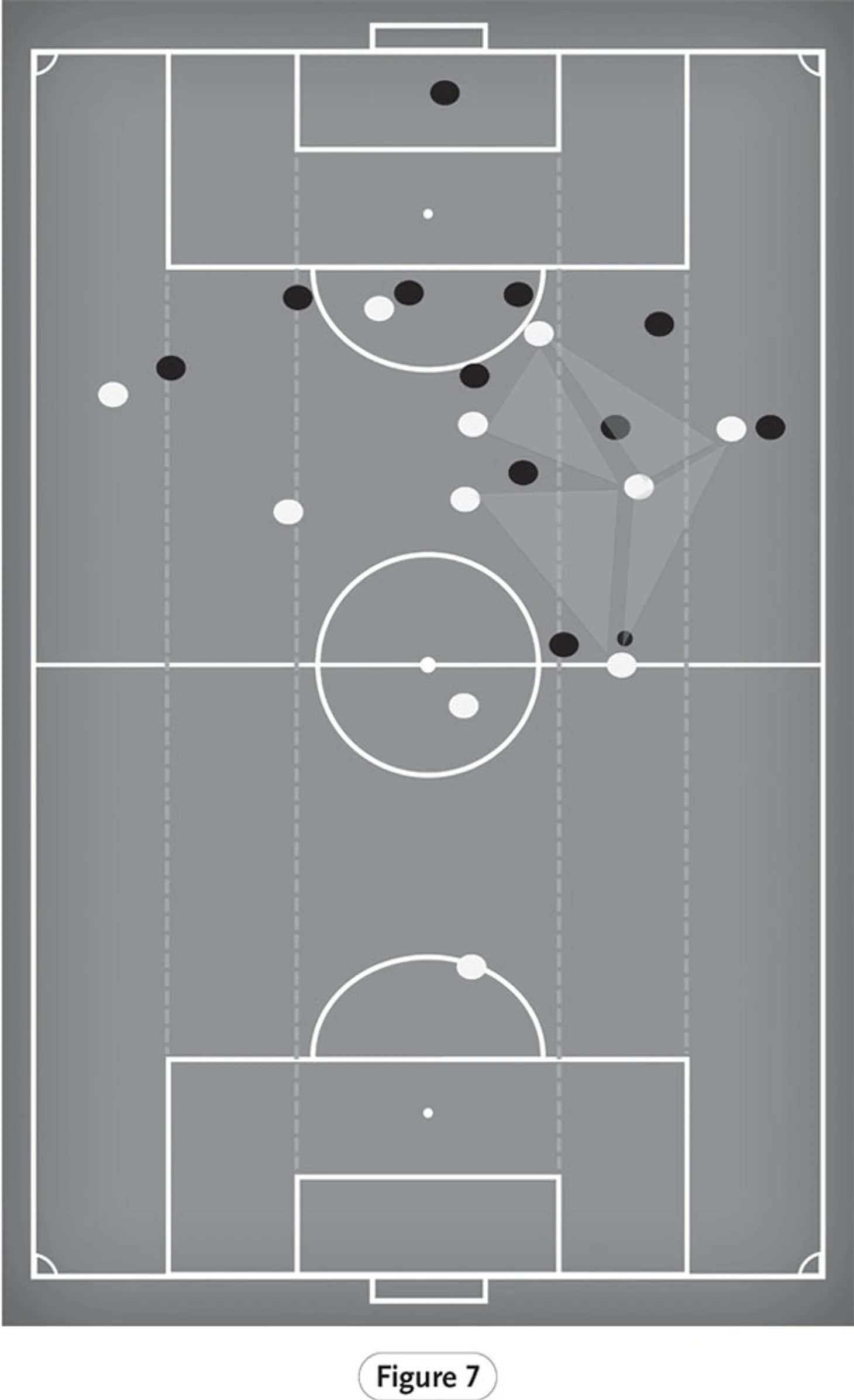 На рисунке 7 мы видим пример важности этой опорной позиции для общей структуры «Ливерпуля». С инвертируемым Александер-Арнолдом и в полупространстве он находится в центре группы игроков «Ливерпуля» с расположенными вокруг него пятью другими игроками. Он является ключом к структуре в том смысле, что его позиционирование создает серию треугольников, которые позволяют быстро перемещать мяч и изменять угол атаки. Эта структура позволяет продвигать мяч, как только открывается линия паса на Мохамеда Салаха, в центре справа, и Роберто Фирмино опускается в пространство на позицию «десятки».
