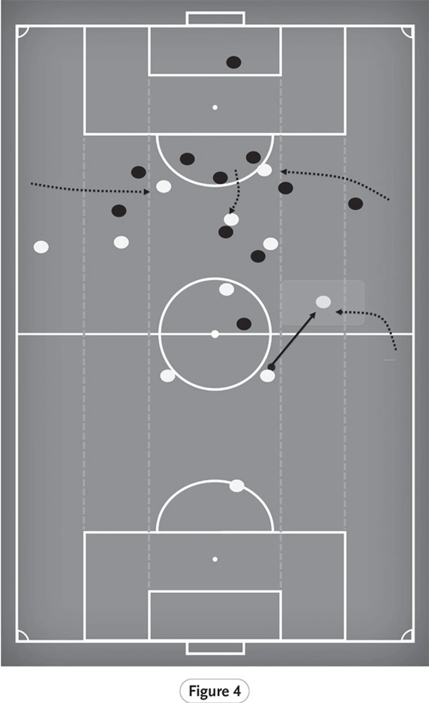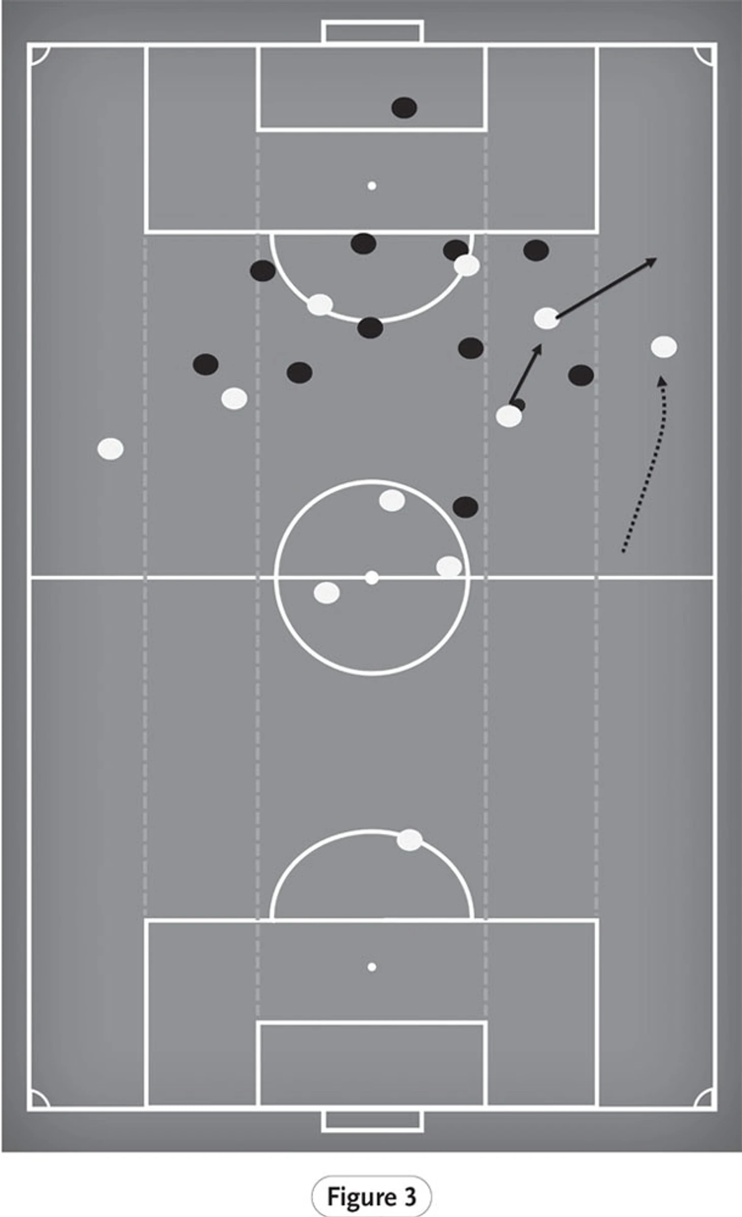 Мы уже касались этого ранее в этой главе, но рисунок 3 дает базовое представление о типичных движениях, которые мы могли бы увидеть в атакующей фазе схемы 4-3-3. Когда мяч движется вперед в позицию «восьмерки» в правом полупространстве, мы увидим, как крайний нападающий смещается в центр, чтобы найти место для получения мяча.