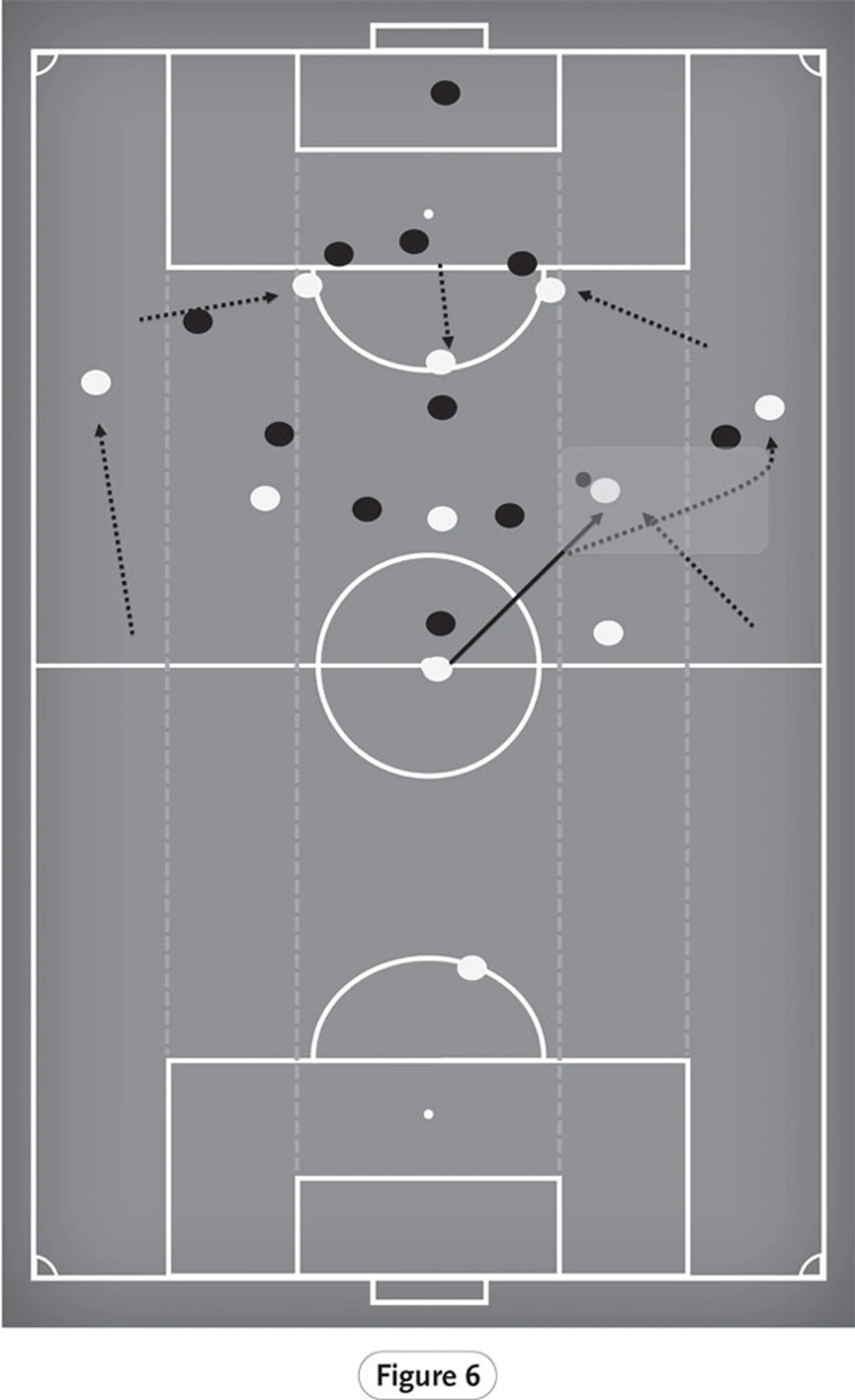 На рисунке 5 мы видим это в действии с владеющим мячом Александер-Арнолдом в полупространстве, хотя на этот раз и в более продвинутой позиции. Возможность паса в край была обеспечена движением правого центрального полузащитника Джордана Хендерсона в этом примере, и это не позволяет крайнему игроку соперника двигаться, закрывая движение мяча. С этой позиции Александер-Арнолду доступен ряд вариантов. Он может отдать легкий пас на фланг Хендерсону, который может свободно двигаться вперед на пространство, или он может разыграть более сложный, но потенциально эффективный пас в штрафную площадку. Молодой англичанин обладает качеством последовательно отдавать пасы с таких углов, которые падают в пространство между линией обороны и вратарем. Умение оценить силу паса в эти зоны — признак в высшей степени одаренного и техничного футболиста.
