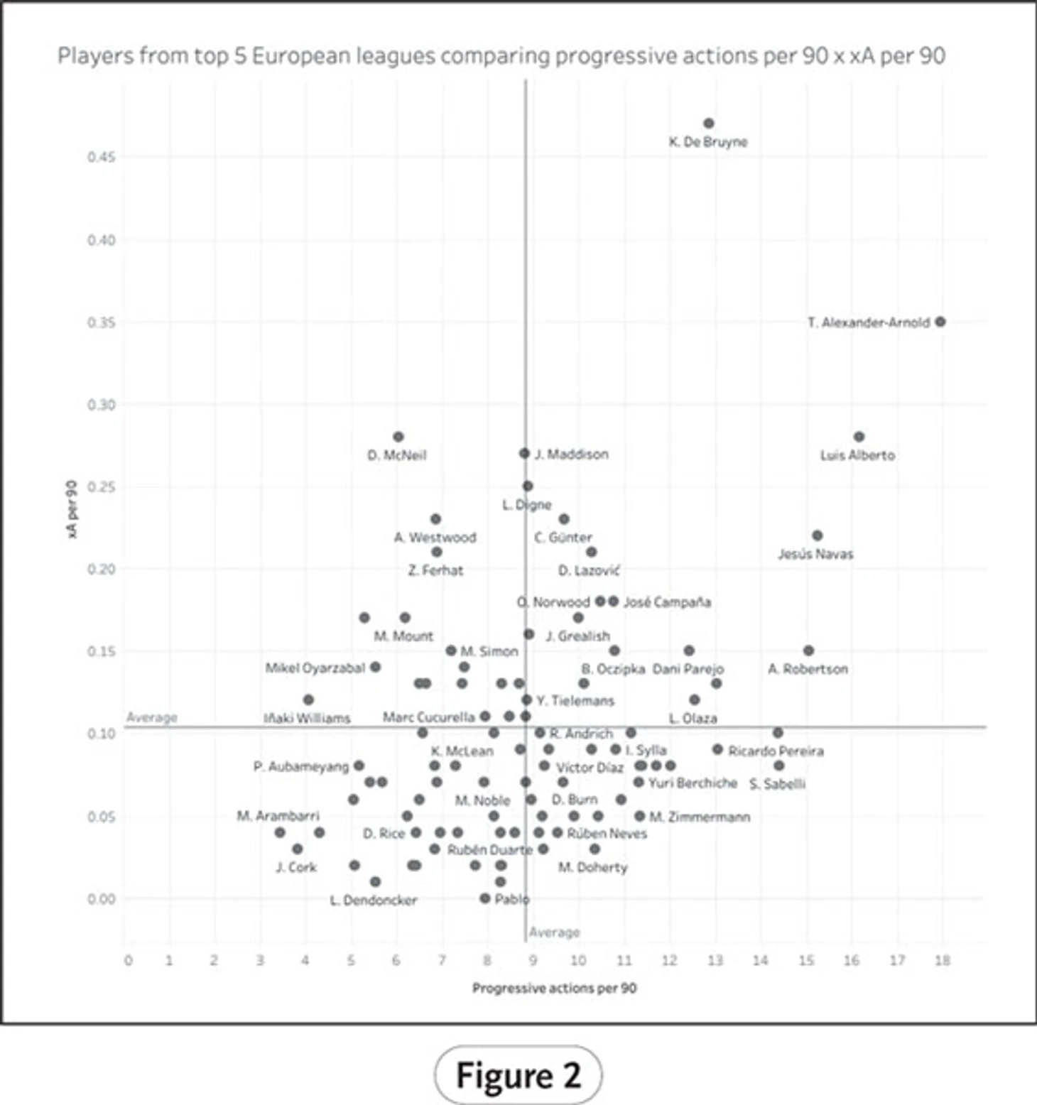 Точечный график на рисунке 2 предназначен для отображения игроков, которые продвигают мяч за свои команды и создают важные моменты. Для этого я создал показатель под названием прогрессивные действия за 90 минут. Это комбинация двух показателей из Wyscout, называемых прогрессивными забегами и прогрессивными пасами за 90 минут. Цель состоит в том, чтобы показать, какие игроки эффективно перемещают мяч на половину соперника и в штрафную площадь. Второй показатель — ожидаемые голевые передачи (xA), который рассчитывается аналогично более известным ожидаемым голам. Это измеряет вероятность того, что моменты, созданные каждым игроком, будут преобразованы в голы.