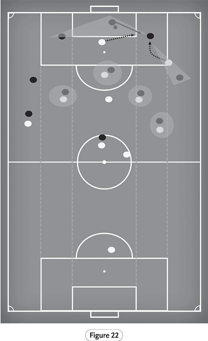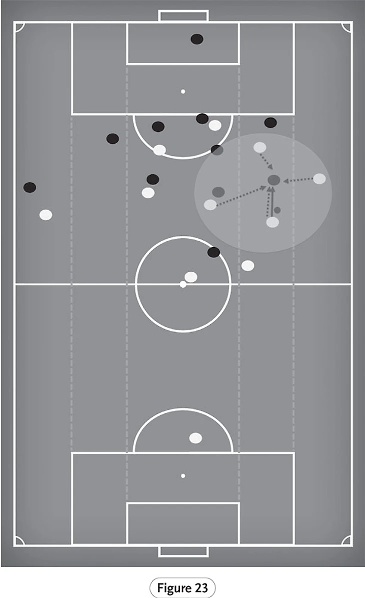 На рисунке 23 показано, как Трент Александер-Арнолд теряет мяч после простого вертикального паса в полупространстве. Игрок соперника прочитал пас и сместился, чтобы занять позицию для перехвата и перехода в атаку. Ключ, однако, заключается в том, что тут уже есть четыре игрока «Ливерпуля», которые могут контрпрессинговать, чтобы вернуть мяч. По мере того, как «Ливерпуль» продвигает мяч через трети и входит в последнюю треть, вся структура движется как единое целое, а центральные защитники стремятся занять позиции как можно выше, до края центрального круга на половине соперника. Затем это позволяет линии полузащиты протискиваться выше к мячу и обеспечивать соединения для перегрузки во владении мячом и контрпрессинга без владения мячом.