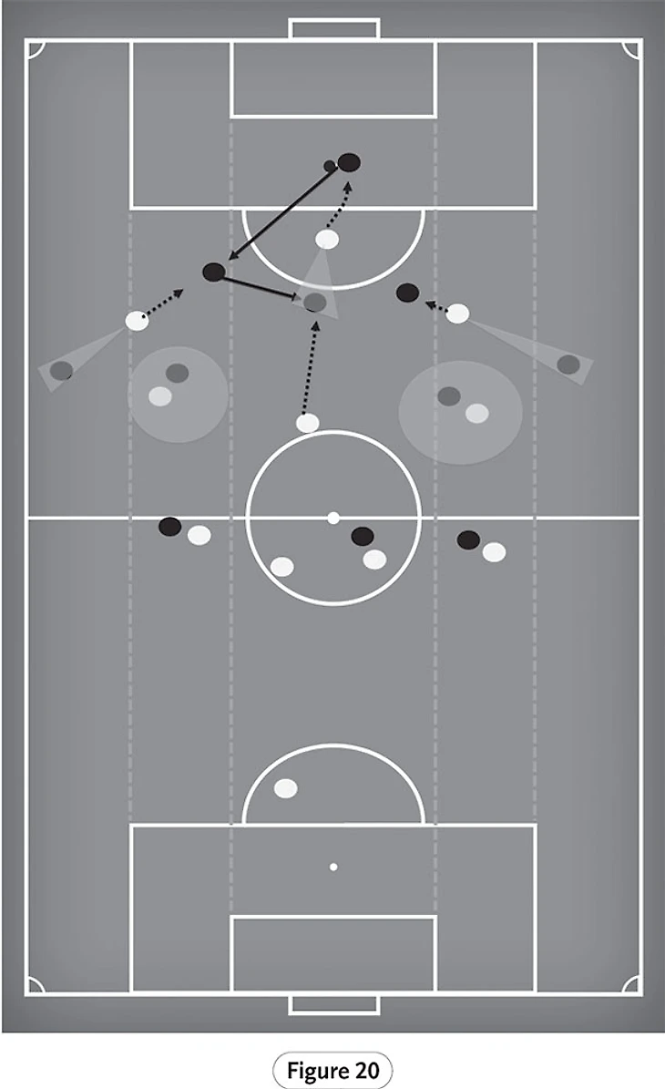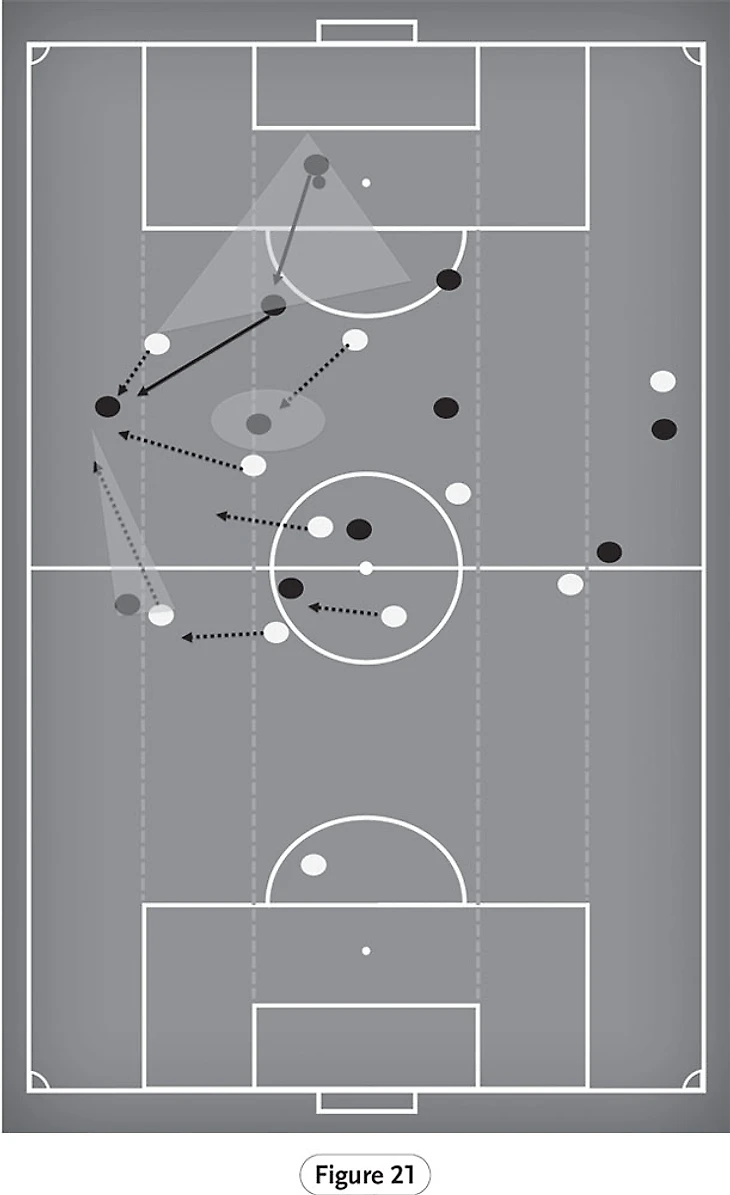 На рисунке 20 мы видим пример типичной структуры прессинга, которую мы наблюдали в «Ливерпуле» в течение сезона 2019/20. Когда мяч изначально находится у вратаря соперника, только нападающий Роберто Фирмино выдвигается, чтобы атаковать мяч. Два крайних нападающих расположены между центральными защитниками и крайними защитниками соперника, и по мере того, как мяч продвигается к центральному защитнику, они сохраняют дистанцию и используют форму своего тела, чтобы отрезать передачу крайним защитникам.