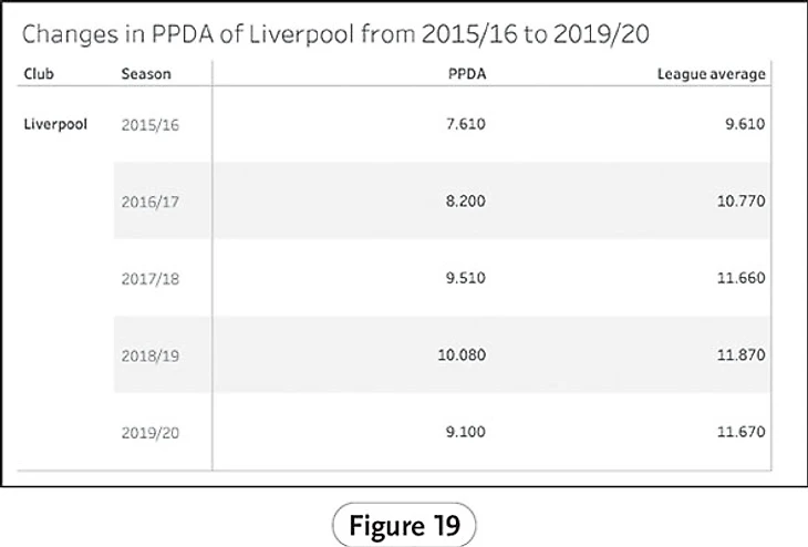 Рисунок 19 представляет собой таблицу, которая может помочь нам начать отвечать на этот вопрос. Мы использовали показатель, известный как PPDA, чтобы показать интенсивность прессинга «Ливерпуля» в каждом сезоне под руководством Клоппа. PPDA означает количество пасов за оборонительное действие и позволяет нам измерить, сколько пасов команда позволяют сделать противнику, прежде чем они вовлекут его в оборонительное действие. Чем ниже PPDA, тем агрессивнее прессинг.