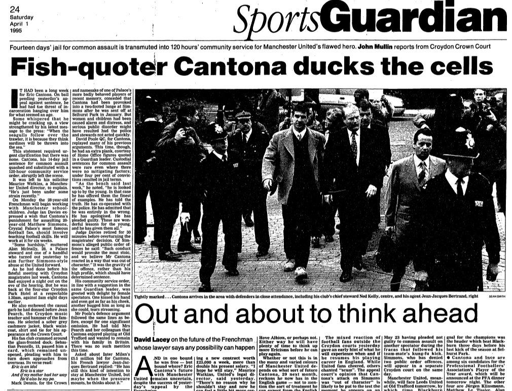 Английский футбол должен решить, хочет ли он полностью уничтожить Эрика Кантона — или, скорее, завершить разрушение, которое он начал много лун назад. [...] Прежде чем он будет пожизненно отстранен от английского футбола, следует спросить, виновен ли он один, не подлежит ли он искуплению, или же футбол может подвергнуть его временному наказанию, которое позволило бы человеку, чье прикосновение может быть величественным, заслужить помилование. Кантона не является ни богом, ни дьяволом, а просто странствующим, хотя и в высшей степени талантливым человеком.