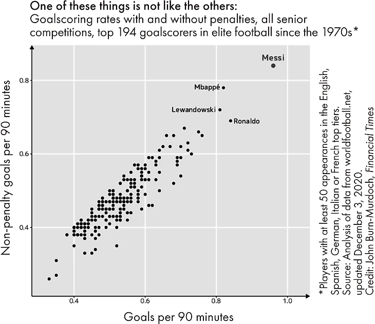 Месси — это еще один Брэдман. Никто не может сравниться с ним. Иан Грэм, директор по исследованиям футбольного клуба «Ливерпуль», заявил, что лучший футболист зарабатывает своей команде на пять очков больше за сезон, чем средний игрок на той же позиции. «И если я «Барселона», — добавил Грэм в 2019 году, — то вон тот игрок, — он указал далеко справа от себя, — добавляет гораздо, гораздо больше, чем пять очков».