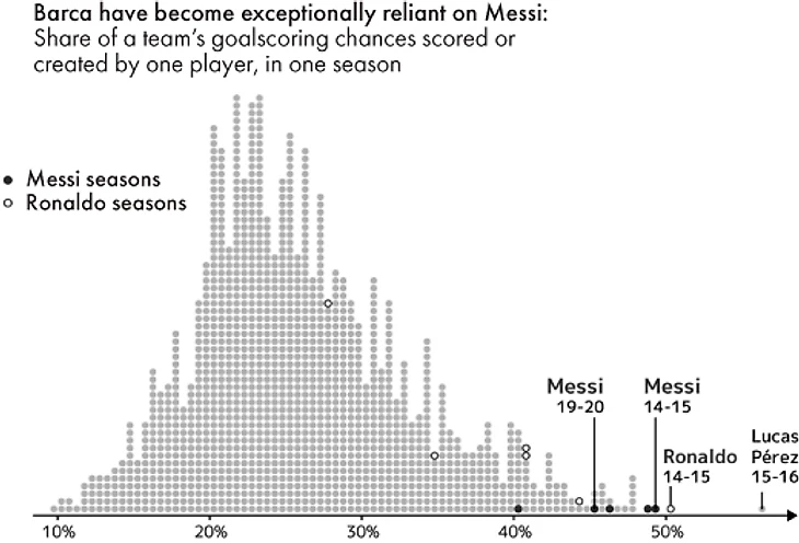 В первое десятилетие пребывания Месси в команде у Хави и Иньесты было достаточно статуса, чтобы не давать ему мяч слишком рано в атаке. Они начинают атаку на другом фланге, ожидая момента, когда можно будет сменить фланг и вывести его один на один с защитником. Но по мере того, как дуэт исчезал из команды, а Неймар ушел, стратегия Барсы упрощалась до мессидепенденсии. По подсчетам Берн-Мердока, с 2017 по 2019 год на долю ударов и передач Месси приходилось от 45% до 49% ожидаемых голов «Барселоны» в год. Почти единственным крупным современным клубом, более зависимым от одного игрока, был мадридский «Реал» (с его Роналдодепенденсии) в сезоне 2014/15. Уровнем ниже Лукас Перес был практически игроком-командой для «Депортиво Ла-Корунья» в сезоне 2015/16.