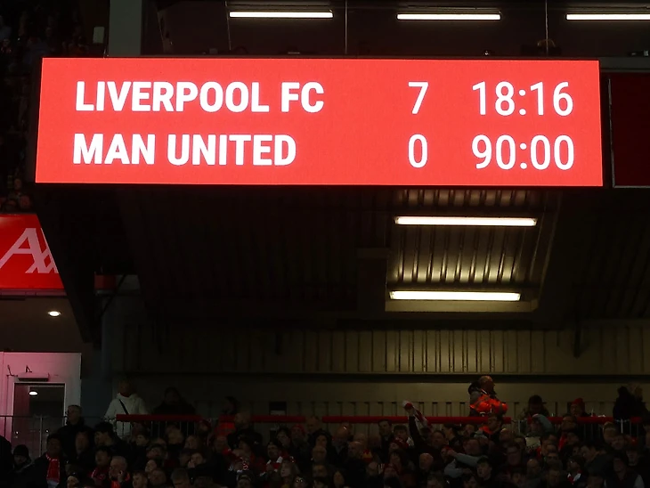 В списке вещей, которые просто не случаются, в списке футбольных чудес, когда «Манчестер Юнайтед» проигрывает 0:4 на «Олд Траффорд» к перерыву, он занимает довольно высокое место. В каком-то смысле 0:4 к перерыву — это более ужасно, чем финальный свисток при 7:0 в 2023 году. Вы можете обманывать себя, что это просто выходит из-под контроля, и говорить себе: «Энфилд»