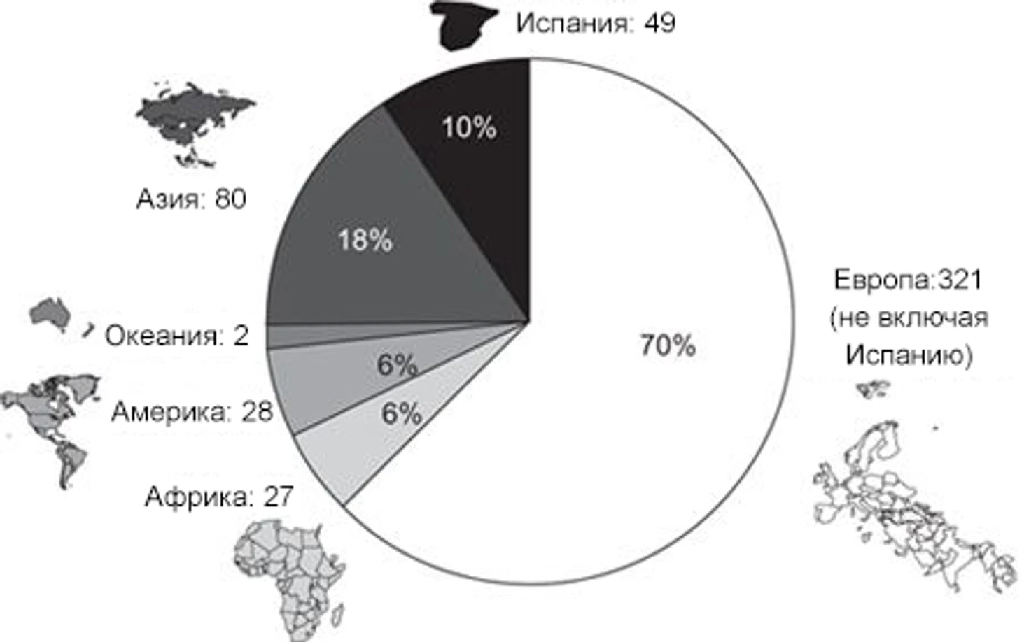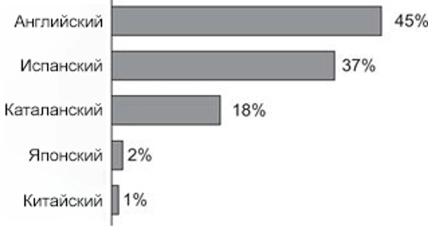 Давайте разберемся, что именно объясняет этот факт и показывает, куда движется футбол. В среднем только 23% телезрителей матчей «Барселоны» находятся в Испании. Остальные, 77%, расположены по всему миру. Когда вы смотрите футбольный матч в Испании, семь из десяти человек, которые смотрят его в это же время, находятся в другой стране. На матчах Лиги чемпионов доля испанских зрителей может составлять всего 10% (см. Рисунок 3.4). Не менее удивительны и данные о посещении сайта www.fcbarcelona.com. В этом контексте наиболее распространенным языком является английский (см. Рисунок 3.5). ФК «Барселона» — это глобальный продукт.