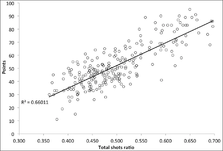 Один из способов обойти ограничения данных — попытаться найти статистические маркеры, на основании которых можно сделать вывод о том, чего нельзя было увидеть. Под псевдонимом «shuddertothink» Бенджамин Пагсли написал впечатляющую подборку ранних статистических анализов для другого блога SB Nation, Bitter and Blue, сайта болельщиков «Манчестер Сити». В начале 2013 года Пагсли обратил внимание на «удары по воротам», а не просто на «удары», полагая, что если удар попал в створ ворот, то он, вероятно, был более качественным, чем тот, который не попал. Был и теоретический аспект. В хоккее бросок, который не попал в ворота, все равно был ценен, потому что шайба могла отрикошетить от заднего борта и запутать защиту, пока атакующая команда сохраняла владение. В футболе удар, который не попал в цель, обычно считался просто сменой владения. Грейсон не обнаружил особой разницы в использовании TSR для всех ударов по сравнению с использованием его только для ударов в створ ворот. Однако Пагсли немного исказил объектив, и вместо того, чтобы рассматривать прогнозные корреляции на протяжении всего сезона, он проанализировал более 1000 отдельных матчей Премьер-лиги, в которых был выявлен победитель. По итогам четырех сезонов он обнаружил, что команды, которые наносили больше ударов по воротам, выиграли 72% не ничейных матчей, в то время как у команд, которые просто перебивали своих соперников, этот показатель составил всего 63%.