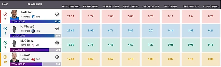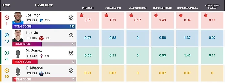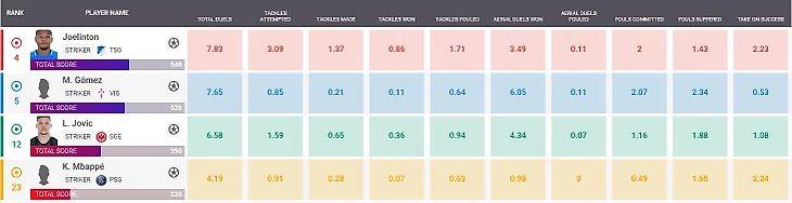 Rank – место игрока после применения статистического фильтра. Т.е. Мбаппе здесь лидер сезона среди форвардов до 23-х лет, Йович 2-й, Гомес – 5-й, а Жоэлинтон – 8-й.