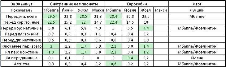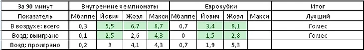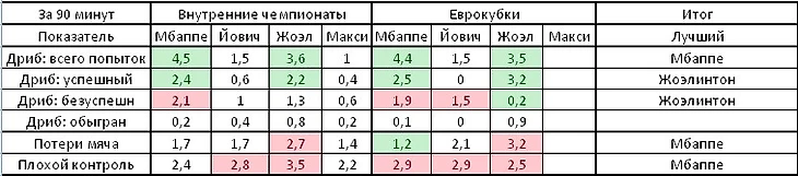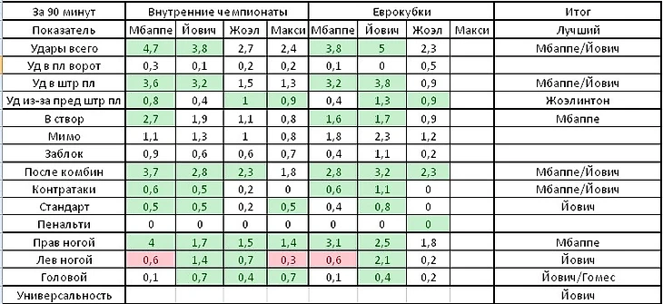 Цифры собранной статистики наглядно делят квартет пополам. Мбаппе и Йович имеют сравнимые показатели с лёгким перевесом француза. Такая же, примерно, картина у Гомеса с Жоэлинтоном. Но какого бы то ни было перевеса тут ни один не имеет.