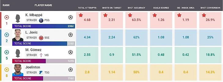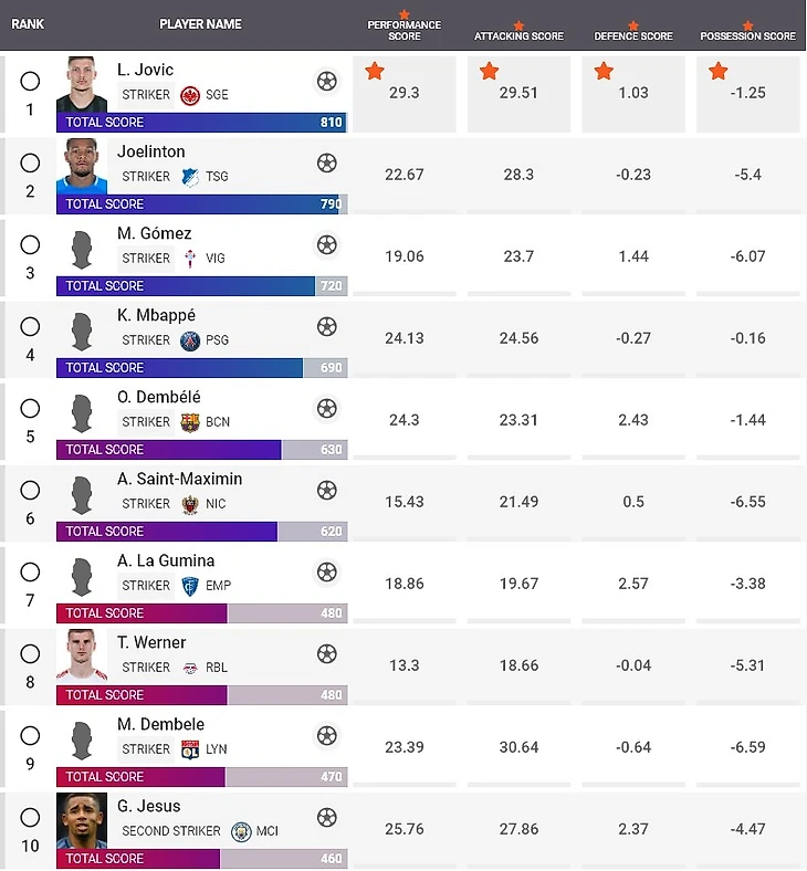 Total Score – общий цифровой итог после подсчёта выбранных показателей. У идущего 3-м Вернера он составляет 1490, т.е Мбаппе (2360) и Йович (2060) заметно ближе друг к другу, чем к остальной массе игроков. Оба демонстрируют тут более высокий уровень футбола. Но Килиан, всё-таки, выделяется. Хотя, будем справедливы, он играет в самой доминирующей команде Лиги 1, при общем невысоком уровне сопротивления соперника. Йович выступает в куда более сложной обстановке. И уровень Бундеслиги – выше, ровнее в целом. И Айнтрахт – далеко не топ. Выводы из этого делайте сами.