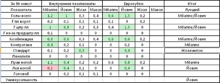 Здесь такая же картина. Йович и Мбаппе заметно эффективнее в забивании мячей. Графа «итог» наглядно это демонстрирует. Дополнительно: Лука Йович показывает себя большим универсалом, забивая голы пропорционально и правой ногой, и левой, и головой. Жоэлинтон менее гибок тут, но тоже, скажем так, может. Макси Гомес силён в игре головой и ударах правой. Мбаппе же крайне «одноногий» нападающий без какой либо игры на втором этаже.