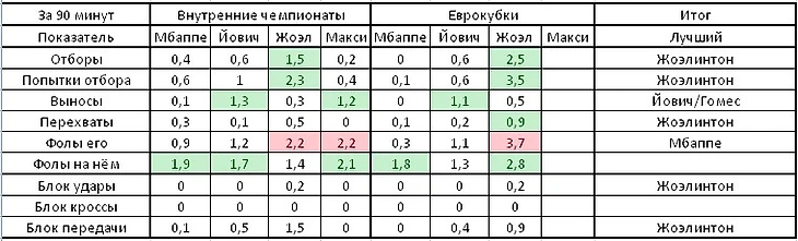 В нашем квартете отмечу, количество блоков Жоэлинтона и выносов Йовича и Гомеса. Т.е. тут можно предположить, что бразилец не опускается глубоко, активно встречает атаки соперника, а серб и уругваец помогают, вероятно при стандартах и угловых. Мбаппе не занимается ни тем, ни другим.